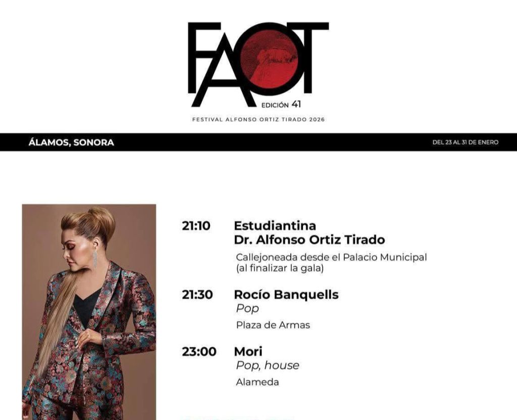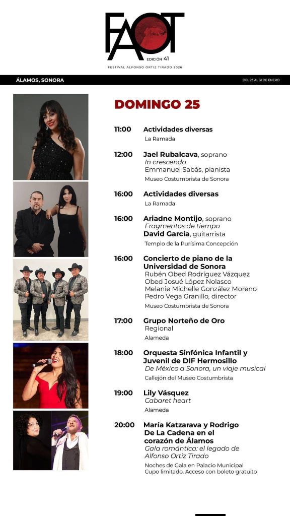 El Festival Alfonso Ortiz Tirado sigue llenando de música, arte y cultura las calles de Álamos. Te compartimos la cartelera del tercer día para que no te pierdas las actividades y sigas disfrutando de esta gran celebración artística en el Pueblo Mágico.
